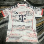 Un design numérique audacieux sur fond blanc avec des nuances de gris et de rose pixelisés. Détail rouge fluo sur les bordures, logo noir contrasté, un look moderne et percutant, idéal pour les matchs à l’extérieur.
