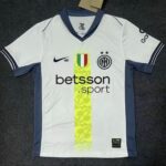 Maillot blanc avec une bande centrale jaune fluo et des détails bleu foncé. Style audacieux et dynamique, idéal pour les fans de l’Inter en déplacement.