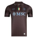 Un design sobre et élégant en brun chocolat, avec les détails bleu ciel typiques du Napoli. L’écusson de champion d’Italie trône fièrement au centre, accompagné du logo EA7 et du sponsor MSC. Un look premium pour dominer à l’extérieur avec classe.